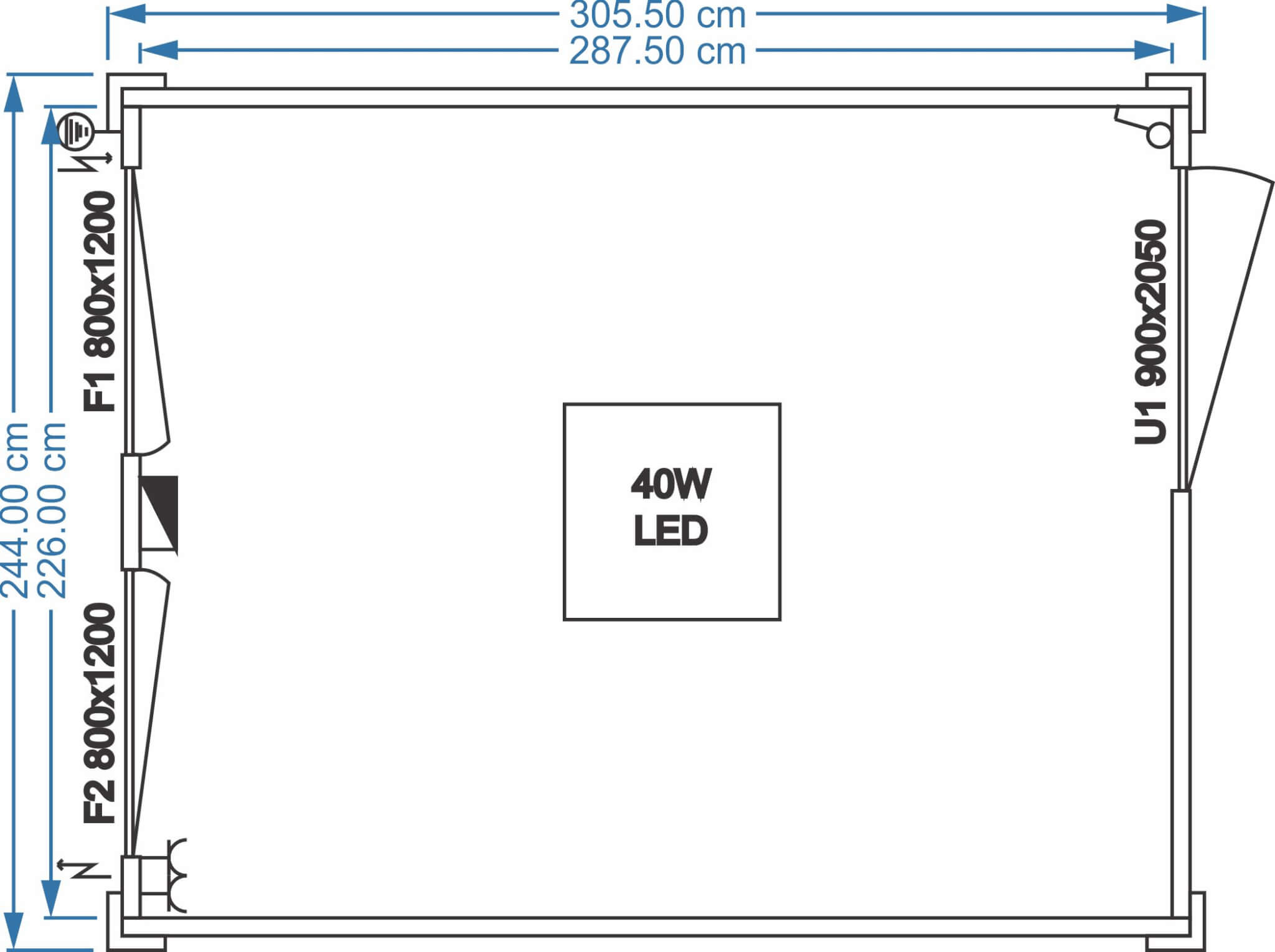 Der Universalcontainer 3,05 m x 2,44 m ist eine vielseitige und robuste Lösung für zahlreiche Anwendungen. Dank seines verzinkten Stahlrahmens mit Epoxid- und Polyurethanbeschichtung gemäß ISO 12944 ist er bestens gegen Korrosion geschützt. Die Wände bestehen aus 50 mm starken Sandwichpaneelen mit Polyurethanschaum (PIR), die eine ausgezeichnete Wärmedämmung und Feuerwiderstand EI15 bieten. Der Boden ist mit einer 150 mm dicken Mineralwollisolierung und einer strapazierfähigen PVC-Beschichtung ausgestattet, während die Decke über eine 200 mm starke Isolierung verfügt. Der Container ist mit einer isolierten Metallbrandschutztür (EI60) und zwei dreh- und kippbaren Kunststofffenstern mit Dreifachverglasung ausgestattet. Das integrierte Regenwassersystem sorgt für eine effiziente Entwässerung. Die elektrische Installation umfasst eine Schalttafel 400V/32A, FI-Schutzschalter und energieeffiziente LED-Beleuchtung. Mit seiner robusten Konstruktion und hochwertigen Materialien ist dieser Container ideal für Lager, Büros oder temporäre Wohnräume geeignet.